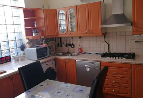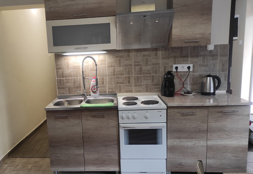 Földszinti apartman, jól felszerelt konyha étkezővel, 2 hálószoba, fürdőszoba, WC